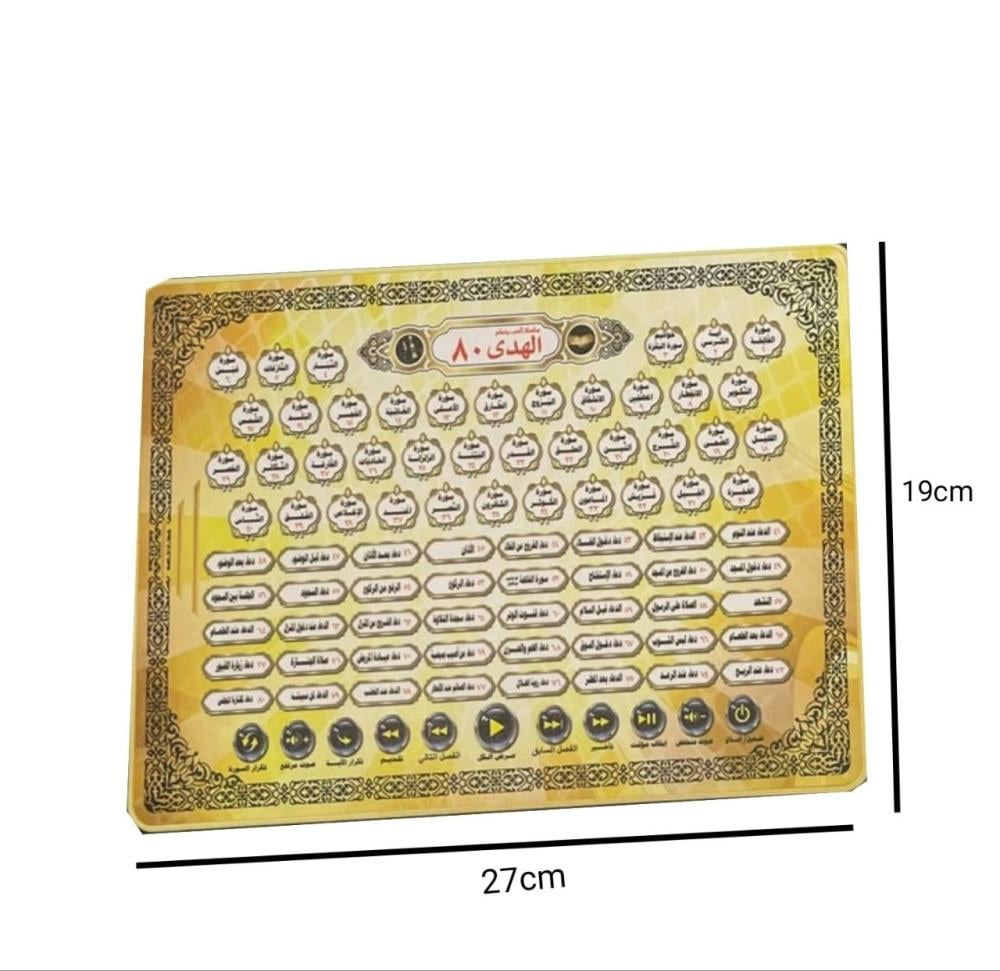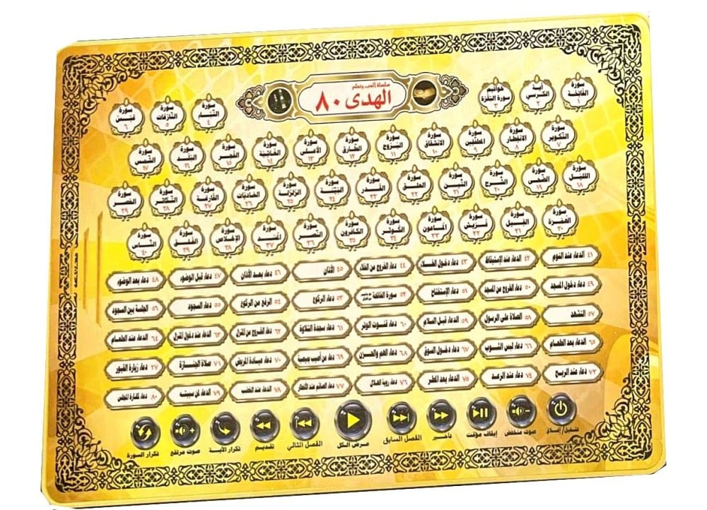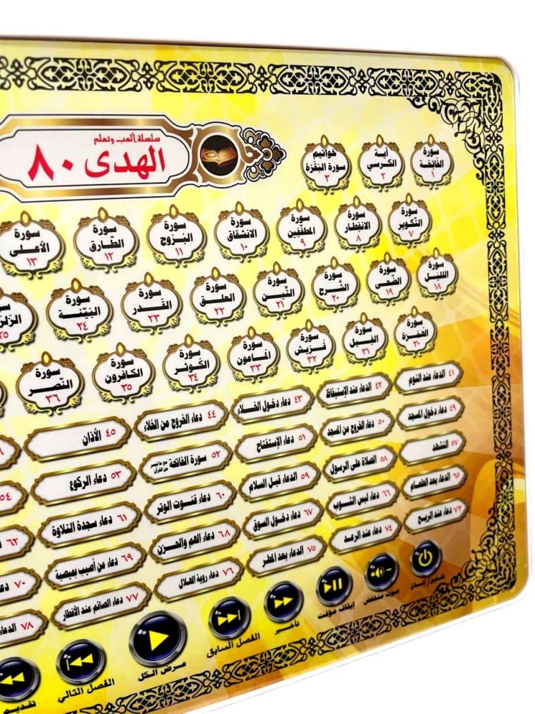 يضم 40 مفتاحًا للقران و40 مفتاحًا للأذكار، مع مفاتيح لمس للتحكم بالتشغيل والإغلاق والتكرار والتحكم في مستوى الصوت. جهاز يجمع بين التعلم والمرح ليناسب كل بيت مسلم.