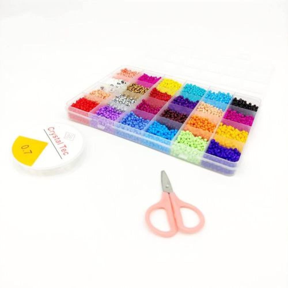 مجموعة خرز صغيرة جدًا لصنع الأساور للبنات. تحتوي على 24 لونًا متنوعًا مع خرز حروف وأدوات مرافقة لصناعة الإكسسوارات.