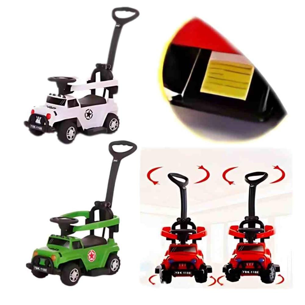 سيارة أطفال فاخرة بتصميم جيب مزودة بحواجز جانبية لحماية الطفل أثناء اللعب. مثالية للاستخدام الداخلي والخارجي مع عجلات متينة ومقبض دفع مريح.